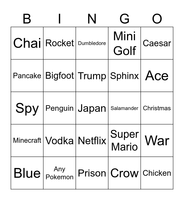 This bingo card has a free space and 24 words: Vodka, Any Pokemon, Trump, Blue, Caesar, Chai, Pancake, Rocket, Salamander, Netflix, Sphinx, Spy, Super Mario, War, Bigfoot, Crow, Christmas, Dumbledore, Ace, Penguin, Chicken, Minecraft, Mini Golf and Prison.