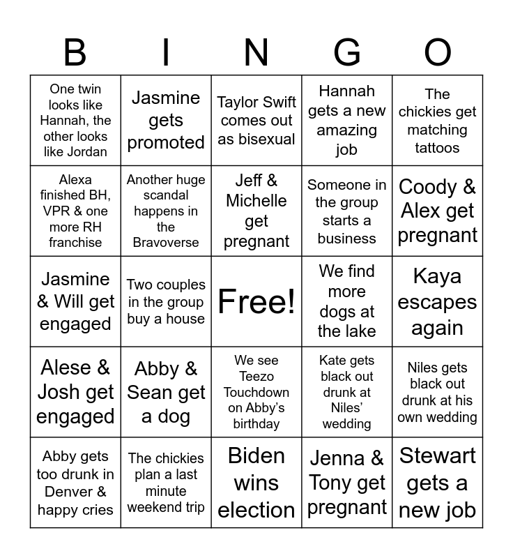 This bingo card has a free space and 24 words: Abby & Sean get a dog, The chickies plan a last minute weekend trip, Jeff & Michelle get pregnant, Abby gets too drunk in Denver & happy cries, The chickies get matching tattoos, One twin looks like Hannah, the other looks like Jordan, Alexa finished BH, VPR & one more RH franchise, Jasmine gets promoted, We find more dogs at the lake, We see Teezo Touchdown on Abby’s birthday, Someone in the group starts a business, Jasmine & Will get engaged, Kate gets black out drunk at Niles’ wedding, Niles gets black out drunk at his own wedding, Another huge scandal happens in the Bravoverse, Jenna & Tony get pregnant, Kaya escapes again, Taylor Swift comes out as bisexual, Coody & Alex get pregnant, Two couples in the group buy a house, Stewart gets a new job, Alese & Josh get engaged, Hannah gets a new amazing job and Biden wins election.