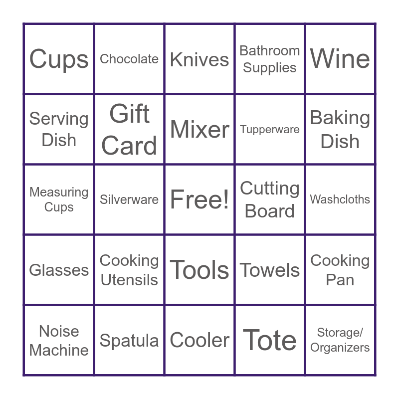 This bingo card has a free space and 34 words: Bed Linens, Tote, Nail Polish, Candle, Glasses, Gift Card, Wine, Noise Machine, Chocolate, Measuring Spoons, Mixer, Knives, Mixing Bowl, Cash, Cutting Board, Baking Dish, Spatula, Measuring Cups, Cooking Utensils, Towels, Tools, Wine Opener, Cups, Washcloths, Cooler, Storage/ Organizers, Bathroom Supplies, Bowls, Tupperware, Serving Dish, Wine Glass, Silverware, Cooking Pan and Glass Bowl/ Dish.