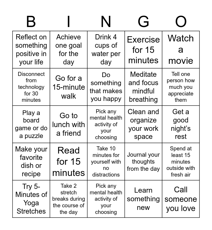 This bingo card has a free space and 29 words: Try 5-Minutes of Yoga Stretches, Visualize a peaceful or calm place and reflect for 5 minutes, Go to lunch with a friend, Ask someone about their day, Reflect on something positive in your life, Drink 4 cups of water per day, Go for a 15-minute walk, Read for 15 minutes, Clean and organize your work space, Take 2 stretch breaks during the course of the day, Get a good night’s rest, Call someone you love, Pick any mental health activity of your choosing, Learn something new, Tell one person how much you appreciate them, Do something artistic, Take 10 minutes for yourself with no distractions, Make your favorite dish or recipe, Watch a movie, Play a board game or do a puzzle, Journal your thoughts from the day, Help someone in need, Meditate and focus mindful breathing, Disconnect from technology for 30 minutes, Exercise for 15 minutes, Achieve one goal for the day, Spend at least 15 minutes outside with fresh air, Do something that makes you happy and Sit with your thoughts and feelings.