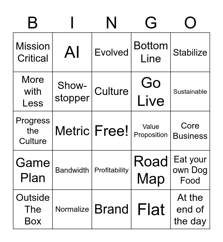 This bingo card has a free space and 39 words: Excited, Right-size, Add Value, Show-stopper, Outside The Box, Profitability, Culture, Lessons Learned, Stabilize, Game Plan, Metric, Bottom Line, At the end of the day, Core Business, Value Proposition, Bandwidth, Conversion, Mission Critical, Open Source, Road Map, More with Less, Brand, Go Live, Sustainable, Reassess, Timelines, Real Priorities, Understanding, Automation, AI, Adjusting to shifts in demand, People Powered Company, Evolved, Normalize, Flat, Shift Left, Eat your own Dog Food, Progress the Culture and Courageous.