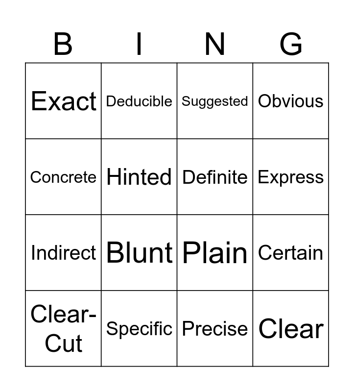 This bingo card has 27 words: Free!, Implied, Indirect, Understood, Hinted, Suggested, Deducible, Clear, Specific, Direct, Plain, Obvious, Positive, Overt, Blunt, Precise, Definite, Express, Obvious, Exact, Precise, Straightforward, Certain, Clear- Cut, Definitive, Concrete and Unequivocal.