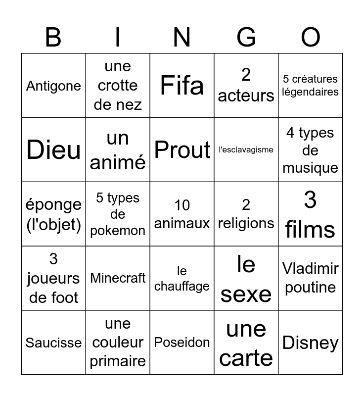This bingo card has 25 words: Minecraft, Poseidon, Prout, Saucisse, 5 créatures légendaires, Antigone, Dieu, une crotte de nez, 2 religions, le chauffage, l'esclavagisme, éponge (l'objet), le sexe, Vladimir poutine, un animé, Disney, 3 films, Fifa, 4 types de musique, 5 types de pokemon, 10 animaux, une couleur primaire, 3 joueurs de foot, 2 acteurs and une carte.