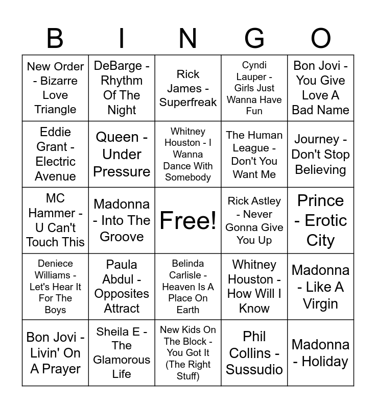 This bingo card has a free space and 46 words: Lionel Richie - All Night Long, Madonna - Holiday, MC Miker G & DJ Sven - Holiday Rap, New Kids On The Block - You Got It (The Right Stuff), Paula Abdul - Opposites Attract, Michael Jackson - Billie Jean, DeBarge - Rhythm Of The Night, Billy Ocean - Caribbean Queen, Eddie Grant - Electric Avenue, Vanilla Ice - Ice Ice Baby, Queen - Under Pressure, Cyndi Lauper - Girls Just Wanna Have Fun, Madonna - Like A Virgin, Whitney Houston - How Will I Know, Sheila E - A Love Bizarre, The Time - Jungle Love, Whitney Houston - I Wanna Dance With Somebody, Rick Astley - Never Gonna Give You Up, David Bowie - Let's Dance, Bon Jovi - You Give Love A Bad Name, Madonna - Into The Groove, Phil Collins - Sussudio, New Order - Bizarre Love Triangle, The Human League - Don't You Want Me, ABC - The Look Of Love, Journey - Don't Stop Believing, Bon Jovi - Livin' On A Prayer, Guns N Roses - Sweet Child Of Mine, Belinda Carlisle - Heaven Is A Place On Earth, Deniece Williams - Let's Hear It For The Boys, Tiffany - I Think We're Alone Now, Irene Cara - Flashdance (What A Feeling), The Eurythmics - Sweet Dreams (Are Made of This), Van Halen - Jump, Pat Benatar - Hit Me With Your Best Shot, Sheila E - The Glamorous Life, Prince - Erotic City, Michael Jackson - P.Y.T., Michael Jackson - Wanna Be Startin Somethin, Marvin Gaye - Got To Give it Up, Prince - When Doves Cry, Rick James - Superfreak, MC Hammer - U Can't Touch This, Duran Duran - Hungry Like The Wolf, New Order - Blue Monday and Depeche Mode - Just Can't Get Enough.