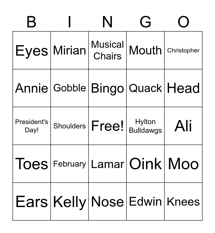 This bingo card has a free space and 24 words: February, Kelly, Bingo, Ears, Christopher, Eyes, Annie, Mirian, Hylton Bulldawgs, Lamar, Quack, President's Day!, Oink, Moo, Gobble, Edwin, Ali, Musical Chairs, Head, Shoulders, Knees, Toes, Mouth and Nose.