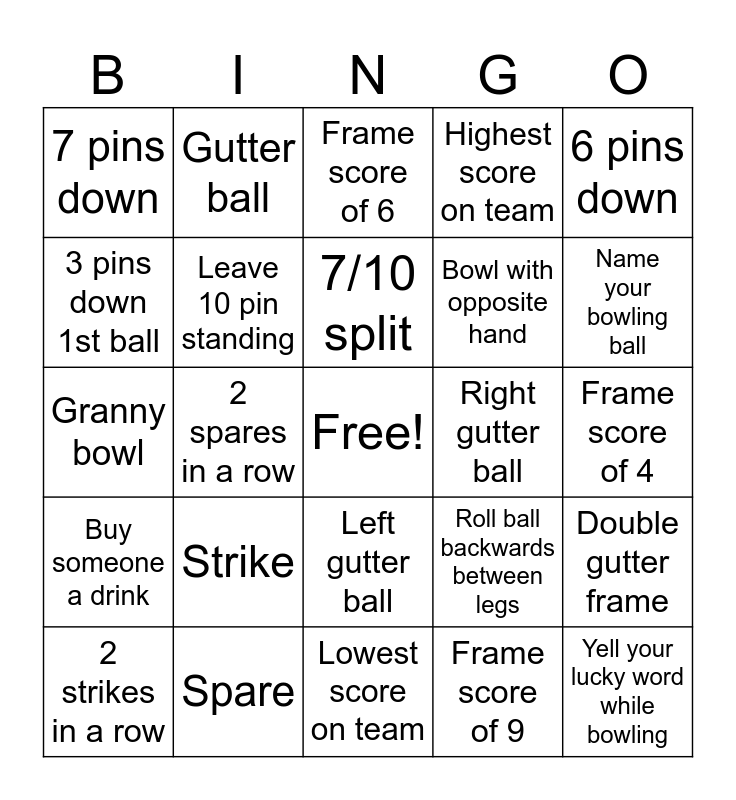 This bingo card has a free space and 24 words: Strike, Spare, 7/10 split, 2 strikes in a row, 6 pins down, 7 pins down, 3 pins down 1st ball, Gutter ball, Right gutter ball, Left gutter ball, Bowl with opposite hand, Granny bowl, Roll ball backwards between legs, Double gutter frame, Leave 10 pin standing, Frame score of 9, Frame score of 4, Frame score of 6, Name your bowling ball, 2 spares in a row, Yell your lucky word while bowling, Buy someone a drink, Highest score on team and Lowest score on team.