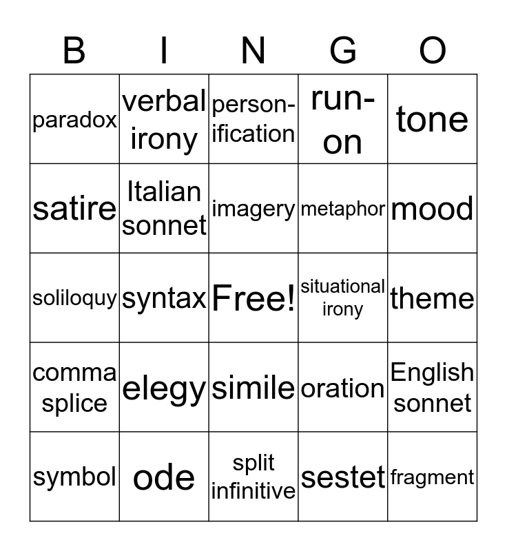 This bingo card has a free space and 24 words: elegy, ode, imagery, symbol, tone, paradox, satire, verbal irony, situational irony, simile, metaphor, soliloquy, oration, English sonnet, Italian sonnet, sestet, theme, person-ification, mood, syntax, fragment, comma splice, run-on and split infinitive.