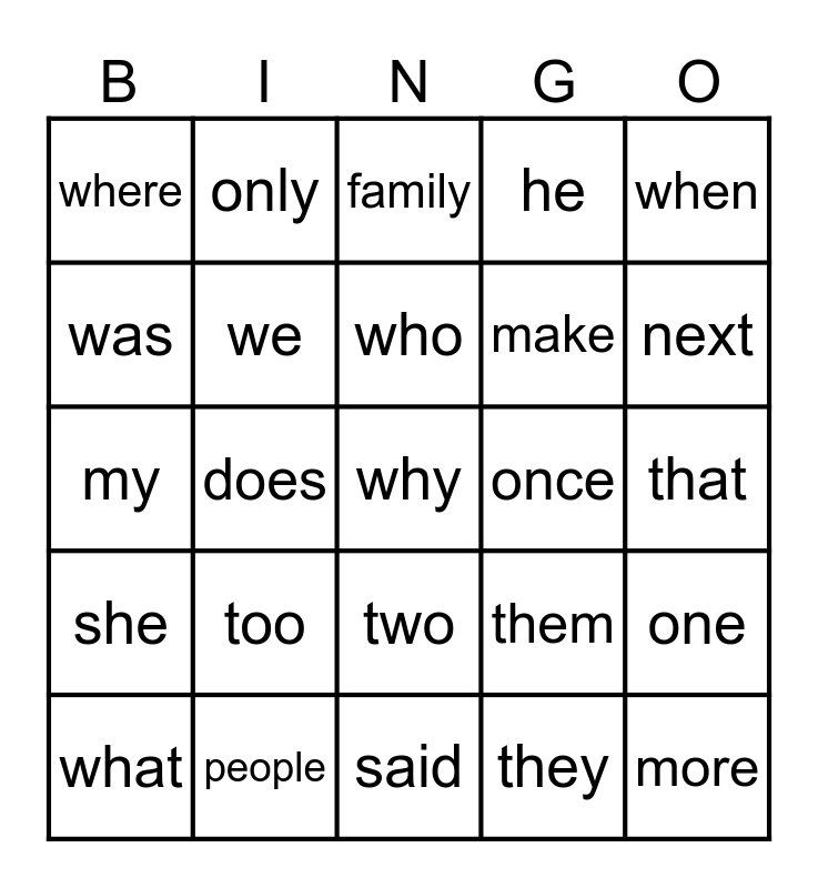 This bingo card has 25 words: too, said, who, what, when, where, was, only, once, two, make, my, them, one, we, more, that, family, next, does, why, people, she, he and they.
