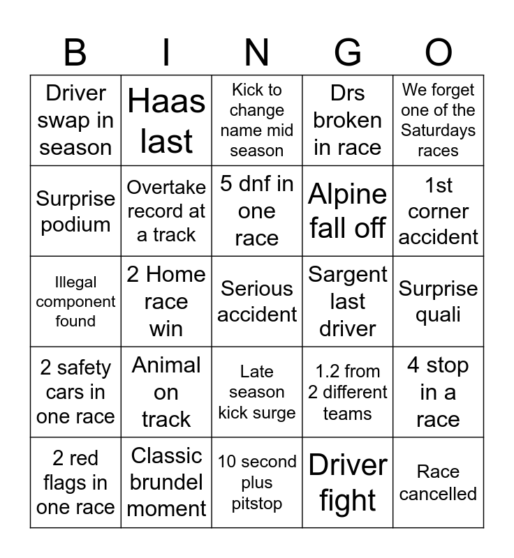 This bingo card has a free space and 24 words: Animal on track, Classic brundel moment, 5 dnf in one race, 2 red flags in one race, We forget one of the Saturdays races, Driver swap in season, Surprise podium, Haas last, Sargent last driver, Late season kick surge, Alpine fall off, Illegal component found, 1.2 from 2 different teams, 4 stop in a race, Overtake record at a track, Driver fight, Surprise quali, Kick to change name mid season, 1st corner accident, 2 Home race win, Race cancelled, 2 safety cars in one race, Drs broken in race and 10 second plus pitstop.