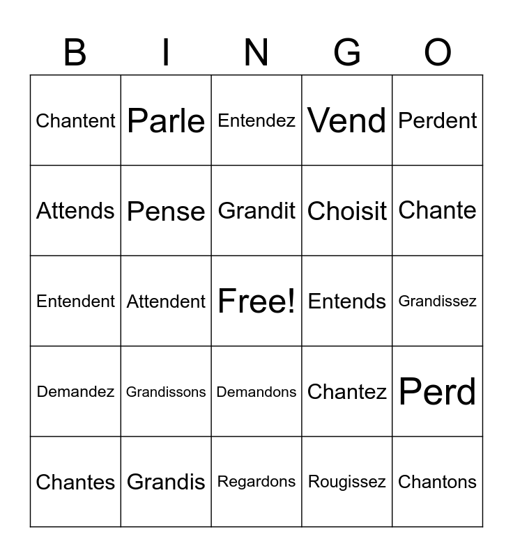 This bingo card has a free space and 47 words: Regard, Chantons, Demandes, Regardons, Grandissons, Choisissez, Parle, Entendons, Attends, Rougis, Pense, Vend, Perd, Chantez, Attendons, Rougissent, Grandit, Entends, Vendons, Perdent, Attendent, Rougissez, Chantent, Choisit, Regardes, Chante, Chantes, Demande, Demandons, Demandez, Demandent, Regardent, Choisis, Choisissons, Choisissent, Grandis, Grandissez, Grandissent, Attend, Attendez, Entend, Entendez, Entendent, Rougit, Rougissons, Vendez and Vendent.