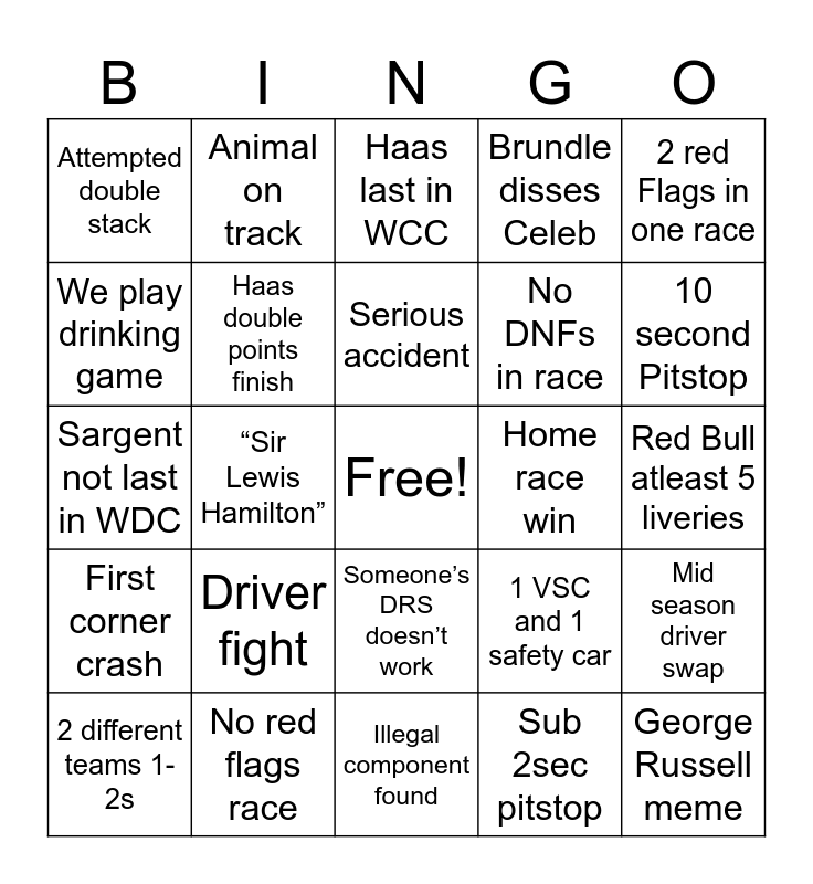 This bingo card has a free space and 24 words: Driver fight, No red flags race, Serious accident, 2 different teams 1-2s, 2 red Flags in one race, Attempted double stack, We play drinking game, Animal on track, Home race win, Someone’s DRS doesn’t work, No DNFs in race, Sargent not last in WDC, 1 VSC and 1 safety car, Mid season driver swap, Haas double points finish, Sub 2sec pitstop, Red Bull atleast 5 liveries, Haas last in WCC, 10 second Pitstop, “Sir Lewis Hamilton”, George Russell meme, First corner crash, Brundle disses Celeb and Illegal component found.