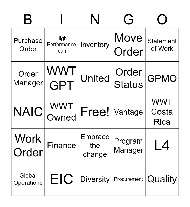 This bingo card has a free space and 90 words: Humility, Trust, Embrace the change, Passion, Teamwork, Attitude, Honesty, The Path, IML, Coaching, Core Values, No surprises, Business, WWT Costa Rica, The Right People, United, WWT You, ERGs, Ohana, HEARD, VETS, LEAD, Diversity, Inclusion, NAIC, EIC, AIC, ATC, Lab, L2, L3, L4, Sales Order, Work Order, Purchase Order, Move Order, Inventory, Consigned, WWT Owned, GPMO, Global Operations, Order Manager, Inside Sales Rep, Project Engineer, Project Manager, Program Manager, Service Delivery Manager, Customer Service Executive, Sales Executive, Program, Reportal, Order Status, ServiceNow, Self-Service Portal, Tableau, DocMan, Vantage, Kronos, Timex, AI, Cisco, Webex, Teams, UDEMY, Coupa, Account Manager, Program Management, Procurement, Logistics, Professional Services, Finance, Quality, Service Request Center, Productio Control, High Performance Team, WWT GPT, Sharecare, Sharepoint, Leadership, Global Supplier Management, Legal and Compliance, Statement of Work, Engineer To Order, ORCA, Oracle, Quoting, Sourcing, Buyer, Partner Playbook and Data Management.