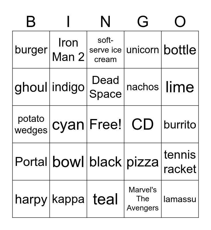 This bingo card has a free space and 24 words: bowl, kappa, Dead Space, harpy, bottle, burger, ghoul, Iron Man 2, CD, black, nachos, potato wedges, pizza, tennis racket, indigo, Marvel's The Avengers, burrito, soft-serve ice cream, lime, cyan, lamassu, Portal, unicorn and teal.