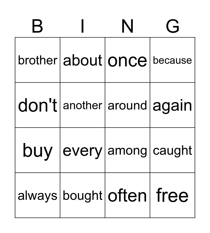 This bingo card has 16 words: bought, caught, once, brother, buy, about, among, often, don't, another, always, because, every, again, around and free.