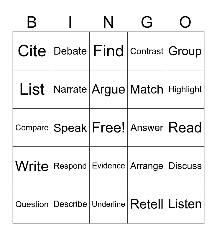 This bingo card has a free space and 28 words: Discuss, Identify, Match, Retell, List, Find, Debate, Write, Answer, Question, Compare, Contrast, Describe, Underline, Highlight, Summarize, Respond, Narrate, Argue, Evidence, Cite, Reasoning, Listen, Speak, Read, Arrange, Group and Outline.