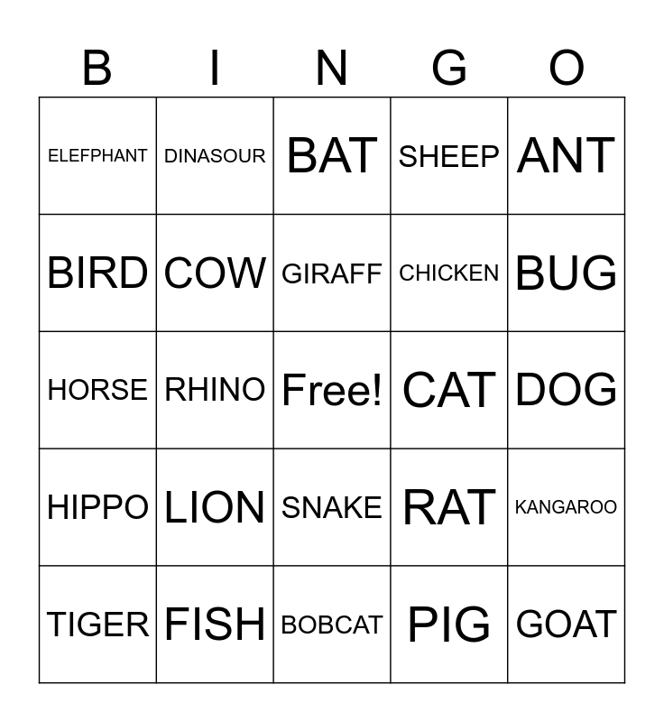 This bingo card has a free space and 24 words: TIGER, LION, GIRAFF, PIG, ANT, ELEFPHANT, DINASOUR, BAT, CAT, DOG, HORSE, COW, RAT, KANGAROO, BIRD, FISH, BOBCAT, SHEEP, BUG, HIPPO, RHINO, SNAKE, CHICKEN and GOAT.