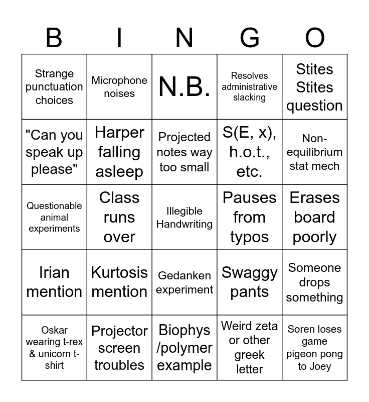 This bingo card has a free space and 24 words: Kurtosis mention, Projector screen troubles, Projected notes way too small, Oskar wearing t-rex & unicorn t-shirt, Stites Stites question, Strange punctuation choices, "Can you speak up please", Microphone noises, Pauses from typos, Gedanken experiment, S(E, x), h.o.t., etc., Questionable animal experiments, Swaggy pants, Someone drops something, Harper falling asleep, Weird zeta or other greek letter, Erases board poorly, N.B., Non-equilibrium stat mech, Class runs over, Soren loses game pigeon pong to Joey, Irian mention, Resolves administrative slacking and Biophys /polymer example.
