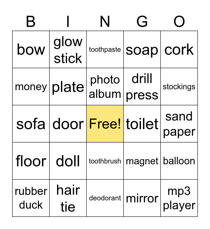 This bingo card has a free space and 24 words: doll, hair tie, photo album, rubber duck, cork, bow, money, glow stick, toilet, toothbrush, drill press, sofa, magnet, balloon, plate, mirror, sand paper, toothpaste, stockings, door, mp3 player, floor, soap and deodorant.