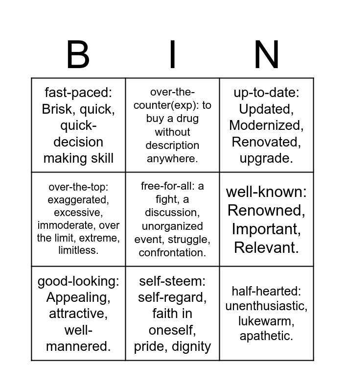 This bingo card has a free space and 8 words: well-known: Renowned, Important, Relevant., up-to-date: Updated, Modernized, Renovated, upgrade., over-the-counter(exp): to buy a drug without description anywhere., good-looking: Appealing, attractive, well-mannered., fast-paced: Brisk, quick, quick-decision making skill, half-hearted: unenthusiastic, lukewarm, apathetic., over-the-top: exaggerated, excessive, immoderate, over the limit, extreme, limitless. and self-steem: self-regard, faith in oneself, pride, dignity.