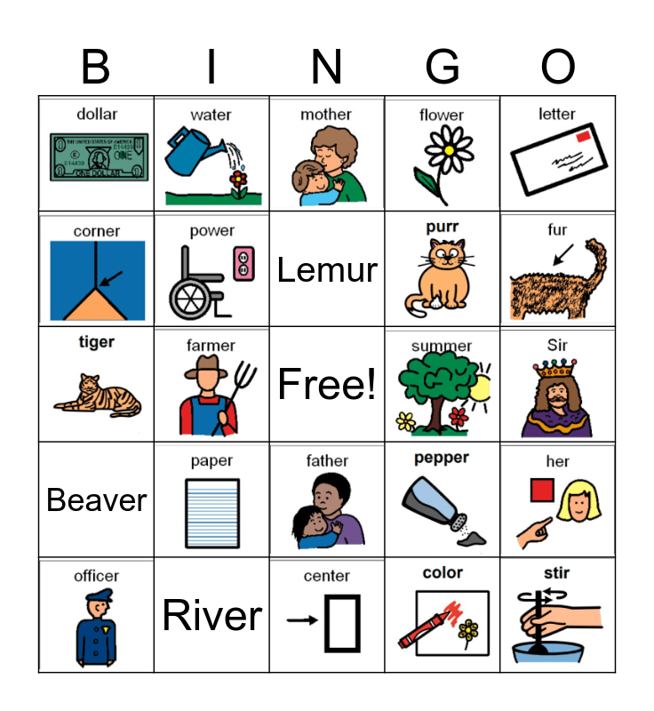 This bingo card has 27 images, a free space and 4 words: Beaver, River, Lemur and Sister.
