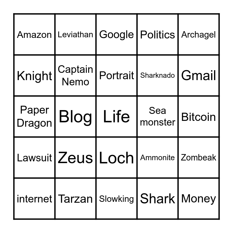 This bingo card has a free space and 24 words: Zeus, Tarzan, Portrait, internet, Archagel, Amazon, Knight, Leviathan, Sea monster, Loch, Sharknado, Paper Dragon, Ammonite, Zombeak, Captain Nemo, Shark, Bitcoin, Google, Gmail, Blog, Money, Lawsuit, Politics and Slowking.