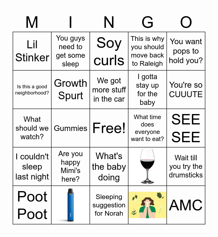 This bingo card has 3 images, a free space and 21 words: Are you happy Mimi's here?, We got more stuff in the car, Poot Poot, You want pops to hold you?, Lil Stinker, Is this a good neighborhood?, You guys need to get some sleep, What time does everyone want to eat?, What's the baby doing, I gotta stay up for the baby, What should we watch?, Wait till you try the drumsticks, Growth Spurt, SEE SEE, Soy curls, You're so CUUUTE, Gummies, AMC, I couldn't sleep last night, This is why you should move back to Raleigh and Sleeping suggestion for Norah.