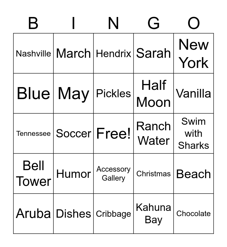 This bingo card has a free space and 24 words: Aruba, Humor, Pickles, Kahuna Bay, New York, Nashville, March, Hendrix, Ranch Water, Swim with Sharks, Tennessee, May, Christmas, Beach, Blue, Dishes, Cribbage, Sarah, Vanilla, Bell Tower, Soccer, Accessory Gallery, Half Moon and Chocolate.