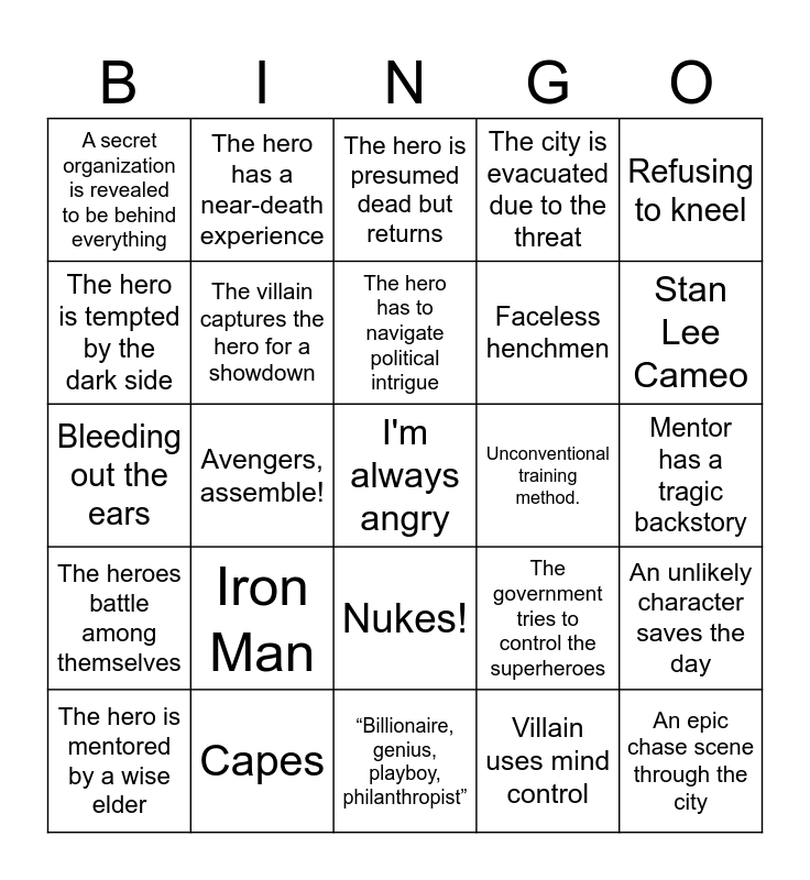 This bingo card has 25 words: Iron Man, “Billionaire, genius, playboy, philanthropist”, The hero has to navigate political intrigue, The hero is mentored by a wise elder, Refusing to kneel, A secret organization is revealed to be behind everything, The hero is tempted by the dark side, The hero has a near-death experience, Unconventional training method., Nukes!, Faceless henchmen, Bleeding out the ears, The government tries to control the superheroes, An unlikely character saves the day, The villain captures the hero for a showdown, An epic chase scene through the city, Mentor has a tragic backstory, The hero is presumed dead but returns, Stan Lee Cameo, Avengers, assemble!, I'm always angry, Capes, The heroes battle among themselves, The city is evacuated due to the threat and Villain uses mind control.