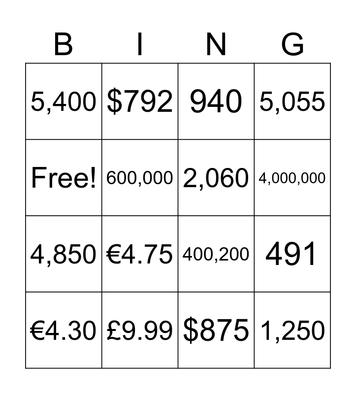 This bingo card has 40 words: 2,000, 400,200, 300,000, 2,060, 1,500, 792, 4,000,000, 8,577, Free!, 1,250, 491, 5,055, €4.30, $875, £9.99, £682, 875, 5,400, 3,500,00, 940, 200,700, 5,000,000, 4,850, 600,000, 9,000, 2,010, 2,100, 17,300, 7,620, 682, 8,566, 7,602, €0.90, €0.99, €4.75, €2.70, £10.10, 85p, $792 and $55.90.