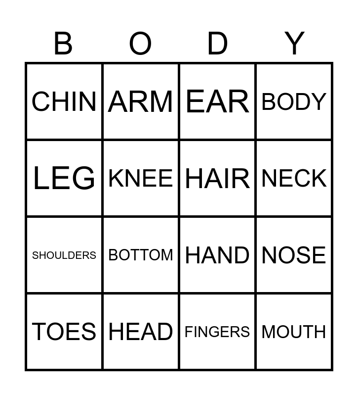 This bingo card has 16 words: HEAD, NOSE, EAR, CHIN, SHOULDERS, ARM, HAND, FINGERS, LEG, KNEE, TOES, BODY, BOTTOM, NECK, HAIR and MOUTH.