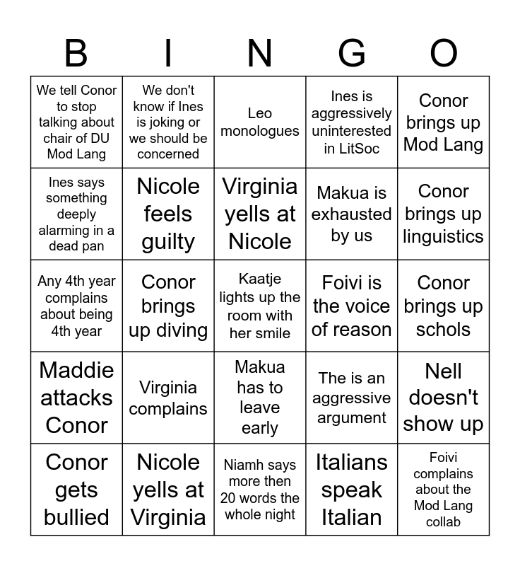 This bingo card has a free space and 24 words: Virginia complains, Nicole yells at Virginia, Virginia yells at Nicole, Conor gets bullied, Conor brings up Mod Lang, We tell Conor to stop talking about chair of DU Mod Lang, Ines says something deeply alarming in a dead pan, We don't know if Ines is joking or we should be concerned, Foivi is the voice of reason, Makua has to leave early, Makua is exhausted by us, Any 4th year complains about being 4th year, The is an aggressive argument, Nell doesn't show up, Nicole feels guilty, Italians speak Italian, Conor brings up schols, Leo monologues, Conor brings up linguistics, Conor brings up diving, Foivi complains about the Mod Lang collab, Maddie attacks Conor, Ines is aggressively uninterested in LitSoc and Niamh says more then 20 words the whole night.