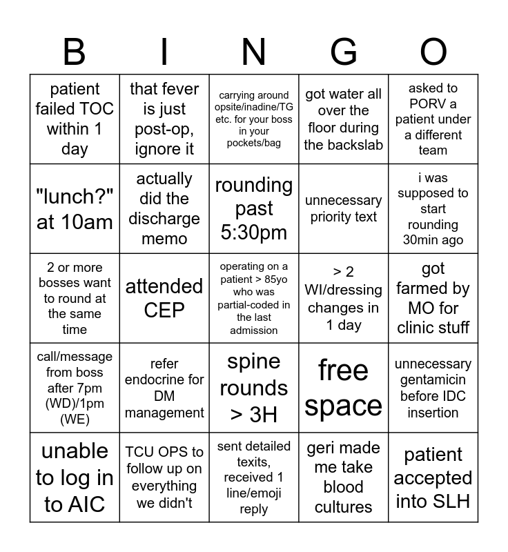 This bingo card has 25 words: refer endocrine for DM management, sent detailed texits, received 1 line/emoji reply, rounding past 5:30pm, unable to log in to AIC, asked to PORV a patient under a different team, patient failed TOC within 1 day, "lunch?" at 10am, that fever is just post-op, ignore it, > 2 WI/dressing changes in 1 day, spine rounds > 3H, unnecessary priority text, 2 or more bosses want to round at the same time, free space, unnecessary gentamicin before IDC insertion, actually did the discharge memo, patient accepted into SLH, got farmed by MO for clinic stuff, carrying around opsite/inadine/TG etc. for your boss in your pockets/bag, i was supposed to start rounding 30min ago, attended CEP, operating on a patient > 85yo who was partial-coded in the last admission, TCU OPS to follow up on everything we didn't, call/message from boss after 7pm (WD)/1pm (WE), got water all over the floor during the backslab and geri made me take blood cultures.