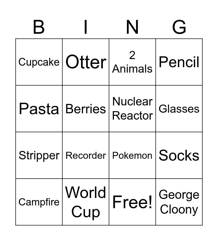 This bingo card has 17 words: Free!, Campfire, 2 Animals, Cupcake, Recorder, Pencil, Socks, Nuclear Reactor, Glasses, Berries, World Cup, Pokemon, Pasta, Otter, Stripper, Tokyo Drift and George Cloony.