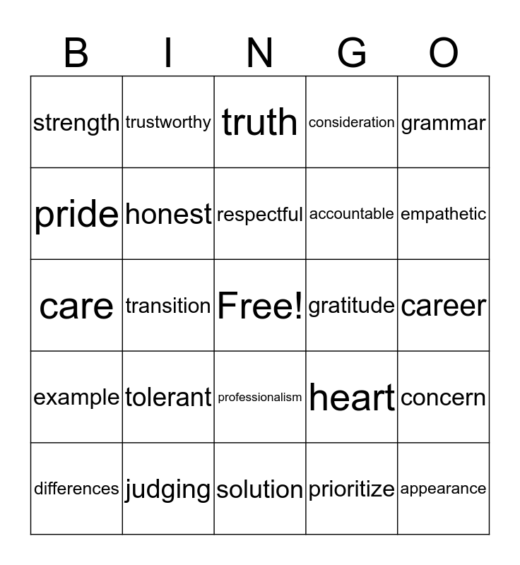 This bingo card has a free space and 27 words: heart, goals, accountable, solution, pride, truth, trustworthy, example, gratitude, concern, care, consideration, differences, judging, empathetic, appreciative, honest, respectful, tolerant, strength, career, prioritize, transition, appearance, professionalism, grammar and successul.