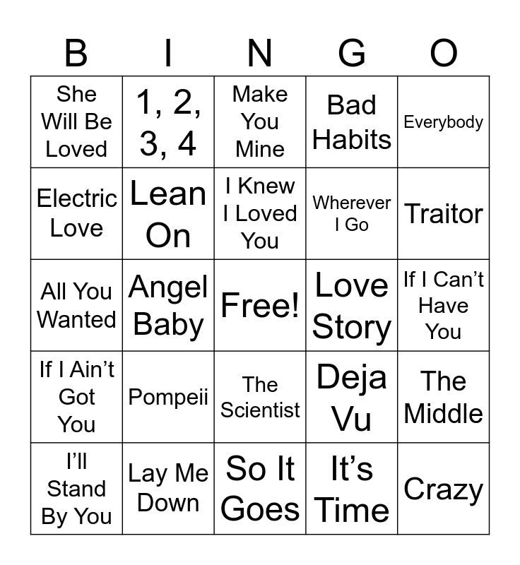 This bingo card has a free space and 111 words: Lucky, Bubbly, I Won’t Give Up, You All Over Me, Butterflies, Stay, Stay With Me, Best Of My Love, How Deep is Your Love, Time After Time, I’ll Make Love To You, You And Me, Back At One, Won’t Go Home Without You, Daylight, What A Feeling, The Scientist, I Can Feel You Breathe, Put Your Records On, Falling Slowly, I’ll Stand By You, Make You Mine, All My Life, I Love You Always Forever, Hold On, We’re Going Home, If I Ain’t Got You, Lay Me Down, Flowers In Your Hair, Sister Golden Hair, Ghost, She Will Be Loved, Angel Baby, Hello My Love, Crimson and Clover, Can’t Take My Eyes Off of You, Can’t Get Enough of Your Love, Someone You Loved, Kiss Me, Delicate, Everlasting Love, Halo, Your Song, Free Love, Just The Two Of Us, I Knew I Loved You, Mess Is Mine, So It Goes, Collide, Wonderful Tonight, Lovefool, Earned It, Someone To You, You’re Still The One, Dedicated To The One I Love, This Is Heaven, Just The Way You Are, Electric Love, Whatcha Say, Fire and the Flood, Rhythm of Love, Lay It All On Me, Whatever It Takes, Fireflies, X, Really Don’t Care, Wherever I Go, Need You Now, I Knew You Were Trouble, Turn The Car Around, Lean On, Traitor, Precious Love, Next To Me, Shadow of the Day, Best Day Of My Life, Unwritten, Part Of Me, Attention, Lights, Pompeii, Big Girls Don’t Cry, It’s Time, Love Story, The Middle, Stitches, Drivers License, Bad Habits, Send My Love, Crazy, All My Favorite Songs, Everybody, Scars To Your Beautiful, Falling In, No One, Prisoner, I Lived, All You Wanted, Someday, Running Up That Hill, Midnight Sky, Better In Time, Never Really Over, Good Grief, If I Lose Myself, Deja Vu, 1, 2, 3, 4, Memories, Wide Awake, Halfway Gone, If I Can’t Have You and Everywhere.