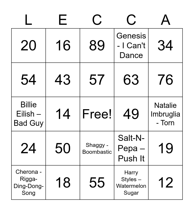 This bingo card has a free space and 140 words: 51, 87, 3, 10, 66, Salt-N-Pepa – Push It, Madness - It Must Be Love, SKC Mineur – Pilsen op de Piste, 81, 40, 36, 44, Rick Astley – Together Forever, Simple Minds - Don't You (Forget About Me), 29, 4, 82, Kym Sims - Too Blind to See It, Barry Badpak - Kratje Bier, 83, 31, 19, Las Kala - The Ketchup Song (Hey Hah), Total Touch - Touch Me There, 35, 14, 16, Sir Mix-A-Lot - Baby Got Back, 86, 85, Britney Spears - I'm a Slave 4 U, Right Said Fred - I’m Too Sexy, 48, Natalie Imbruglia - Torn, 60, 62, 38, SNAP! - Rhythm Is A Dancer, 63, 79, OBZ - Ik Ben Kachel, 37, Shaggy - Boombastic, 71, 32, 52, 61, 65, Katrina & The Waves – Walking on Sunshine, 39, Ten Sharp - You, 67, Cherona - Rigga-Ding-Dong-Song, 84, 56, Red Hot Chili Peppers - Under the Bridge, 75, 58, 23, Counting Crows - Big Yellow Taxi, House Of Pain - Jump Around, Harry Styles – Watermelon Sugar, Volumia! - Afscheid, 27, 88, 24, 33, 59, The Offspring - Pretty Fly (For A White Guy), Guns N' Roses - November Rain, 77, 20, Billie Eilish – Bad Guy, 45, 5, MC Hammer - 2 Legit 2 Quit, 78, K.W.S. - Please Don't Go - Sunshine Mix Original Album, Genesis - I Can't Dance, 28, Vanessa Paradis - Be My Baby, Linda Roos & Jessica - Ademnood, AWOLNATION - Sail, Fatima Yamaha - What's a Girl to Do, 76, Tones and I – Dance Monkey, 49, 22, 55, Sam Smith - Stay With Me, 64, 69, 7, 18, Kelis - Milkshake, 9, 72, 13, 90, 11, 54, Sean Paul - Temperature, 53, 68, 57, 30, Barry Badpak - Disco Machen, 73, Van Halen - Jump, 50, 21, 8, 34, 12, The Proclaimers – I’m Gonna Be (500 Miles), 43, 25, Prince - Diamonds and Pearls, 26, Shaggy - It Wasn't Me, 6, Meja - All 'Bout the Money, Boyz II Men - End Of The Road, 42, 80, 41, 2, 17, 1, Jessica Darrow - Surface Pressure, 15, Bon Jovi - Keep The Faith, Kris Kross – Jump, 47, 70, 89, Lion King - Hakuna Matata, 46, 74 and Bad Lip Reading - Seagulls! (Stop It Now).