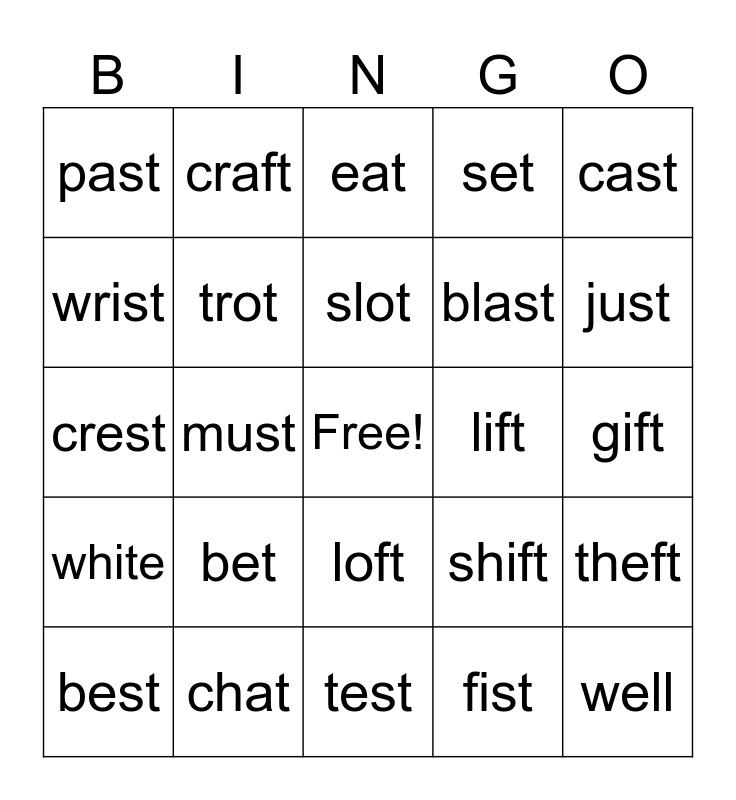 This bingo card has a free space and 24 words: bet, chat, slot, best, cast, past, wrist, craft, lift, loft, blast, crest, shift, theft, trot, fist, gift, eat, just, must, well, white, set and test.