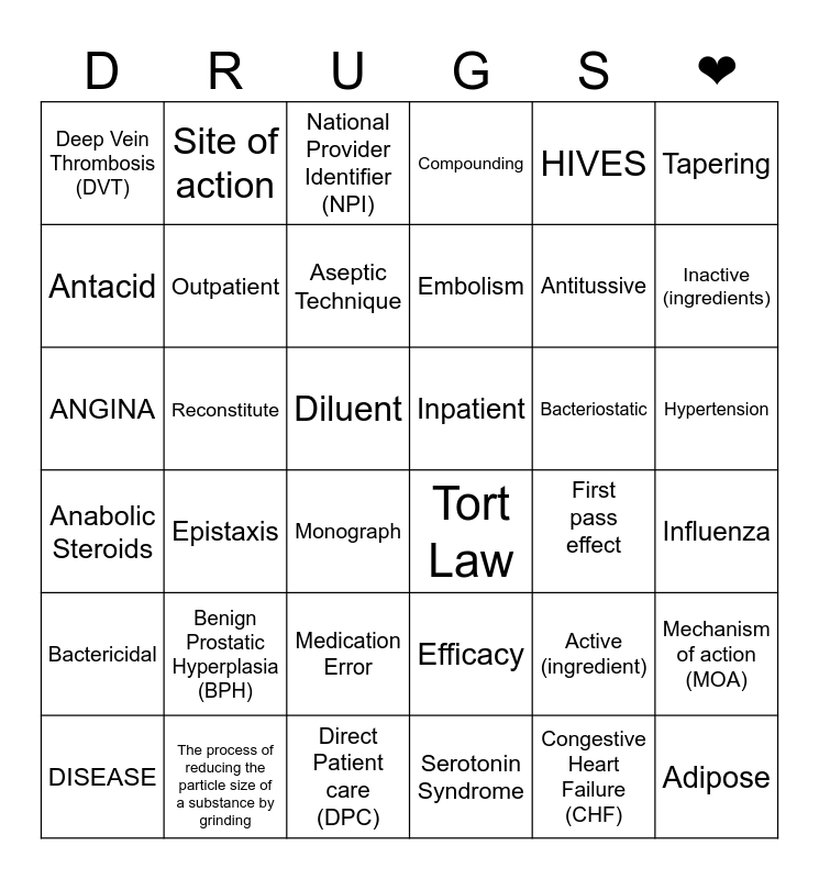 This bingo card has 36 words: Efficacy, Medication Error, Serotonin Syndrome, Antacid, Anabolic Steroids, Inpatient, Outpatient, Direct Patient care (DPC), HIVES, Active (ingredient), Inactive (ingredients), Compounding, Mechanism of action (MOA), Reconstitute, Embolism, Deep Vein Thrombosis (DVT), Bactericidal, Bacteriostatic, ANGINA, National Provider Identifier (NPI), Diluent, Epistaxis, Tort Law, Monograph, First pass effect, Site of action, Antitussive, The process of reducing the particle size of a substance by grinding, Aseptic Technique, Tapering, Adipose, DISEASE, Influenza, Hypertension, Benign Prostatic Hyperplasia (BPH) and Congestive Heart Failure (CHF).