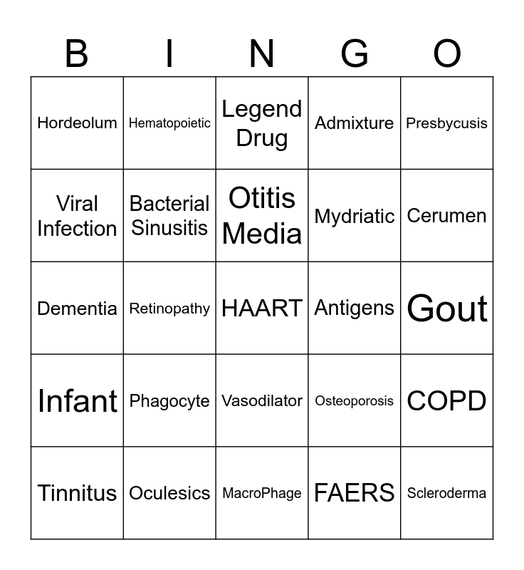 This bingo card has a free space and 49 words: Lymphocytes, Scleroderma, Antibodies, MacroPhage, Phagocyte, Immune System, Hematopoietic, Epitope, Viral Infection, Macular Degeneration, Bacterial Sinusitis, Admixture, COPD, Osteoporosis, Nocebo effect, Additive, Otitis Media, Antigens, Cholesterol, Presbycusis, Retinopathy, FAERS, Hordeolum, Mydriatic, Glaucoma, Cerumen, Tinnitus, Photophobia, Vasodilator, Infant, Asymptomatic, BMI, Neonate, BSA, Oculesics, Proxemics, seborrhea, PDMP, Gout, Psoriasis, CHF, CAD, Alopecia, Dermatitis, Dementia, Legend Drug, Adipose Tissue, Coring and Blepheritis.