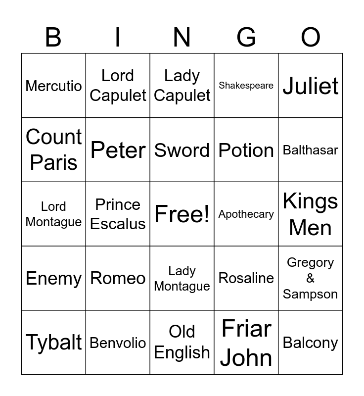 This bingo card has a free space and 24 words: Romeo, Benvolio, Sword, Tybalt, Juliet, Mercutio, Count Paris, Lord Capulet, Apothecary, Lady Montague, Potion, Lord Montague, Rosaline, Gregory & Sampson, Peter, Friar John, Kings Men, Lady Capulet, Balthasar, Prince Escalus, Balcony, Enemy, Shakespeare and Old English.