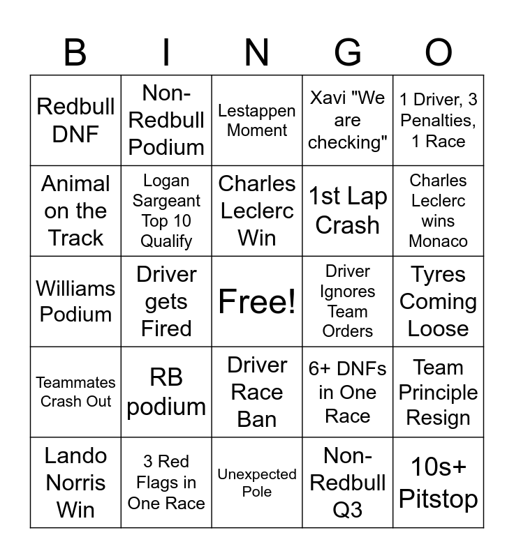 This bingo card has a free space and 24 words: RB podium, 3 Red Flags in One Race, Charles Leclerc Win, Lando Norris Win, 1 Driver, 3 Penalties, 1 Race, Redbull DNF, Animal on the Track, Non-Redbull Podium, Driver Ignores Team Orders, Driver Race Ban, 1st Lap Crash, Williams Podium, 6+ DNFs in One Race, Team Principle Resign, Logan Sargeant Top 10 Qualify, Non-Redbull Q3, Tyres Coming Loose, Lestappen Moment, Charles Leclerc wins Monaco, Driver gets Fired, 10s+ Pitstop, Teammates Crash Out, Xavi "We are checking" and Unexpected Pole.