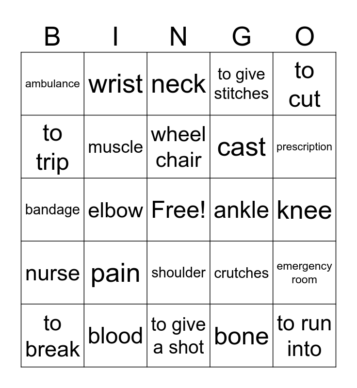 This bingo card has a free space and 24 words: pain, blood, wheel chair, to break, to cut, ambulance, to trip, wrist, ankle, shoulder, cast, bandage, crutches, emergency room, muscle, bone, knee, neck, prescription, elbow, to run into, nurse, to give stitches and to give a shot.