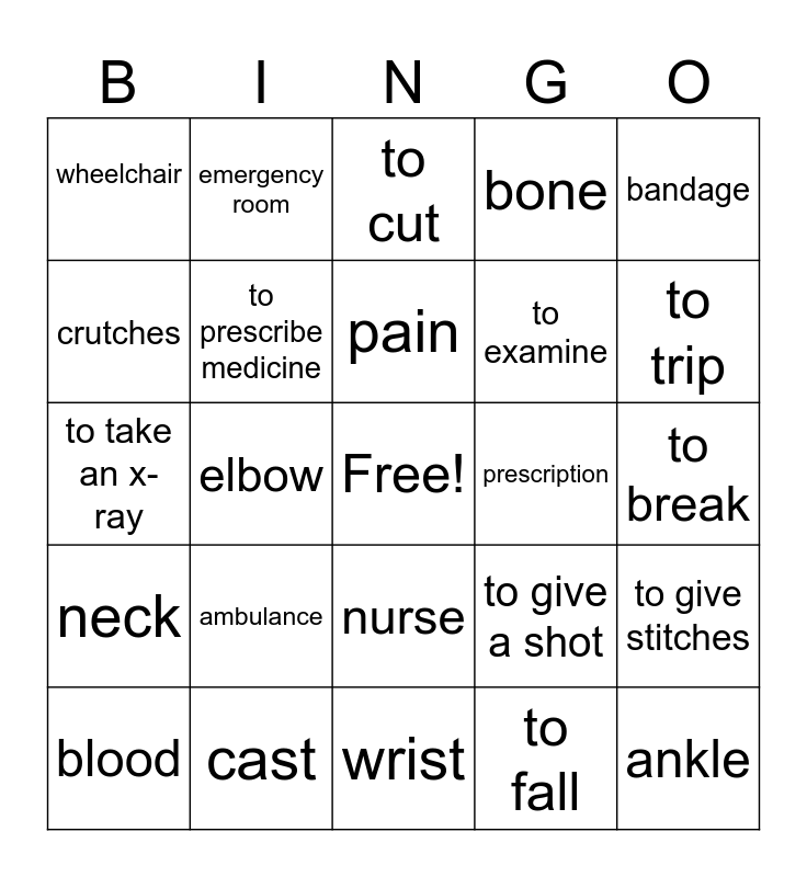This bingo card has a free space and 24 words: ambulance, cast, pain, blood, bandage, wheelchair, crutches, emergency room, prescription, nurse, to examine, to take an x-ray, to give a shot, to give stitches, to prescribe medicine, to fall, to break, to cut, to trip, elbow, ankle, neck, bone and wrist.