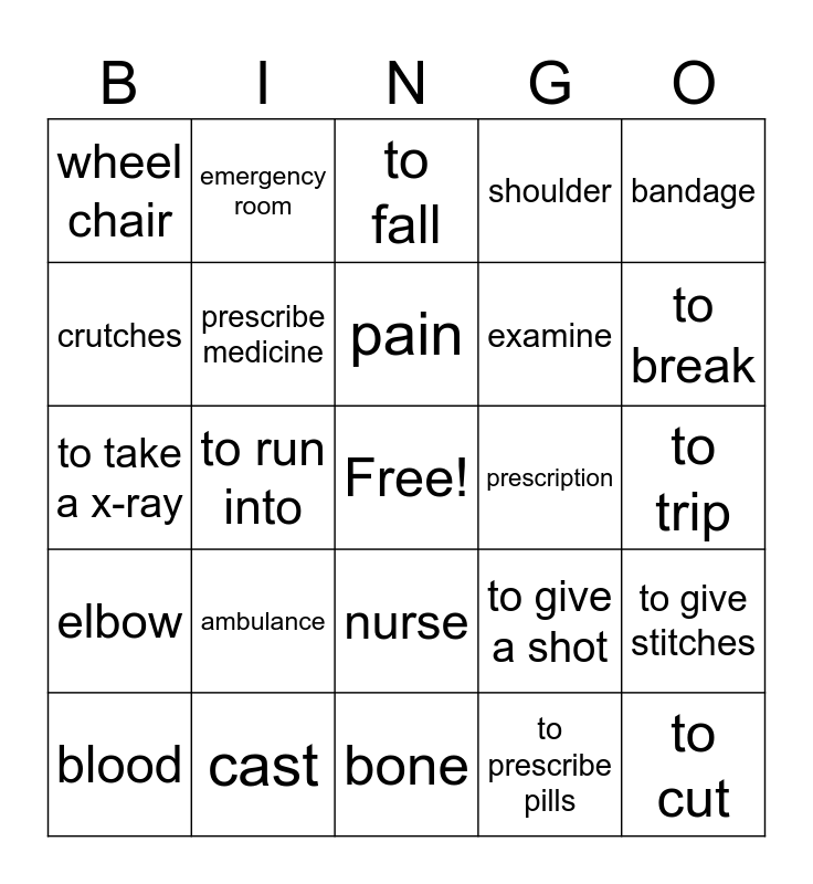 This bingo card has a free space and 24 words: ambulance, cast, pain, blood, bandage, wheel chair, crutches, emergency room, prescription, nurse, examine, to take a x-ray, to give a shot, to give stitches, prescribe medicine, to prescribe pills, to trip, to fall, to break, to run into, to cut, elbow, shoulder and bone.