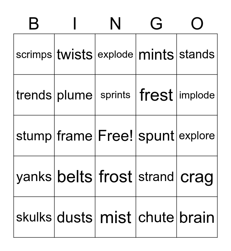 This bingo card has a free space and 24 words: belts, dusts, sprints, skulks, stands, scrimps, trends, twists, spunt, frost, frest, stump, strand, crag, plume, chute, explore, explode, implode, frame, brain, yanks, mints and mist.