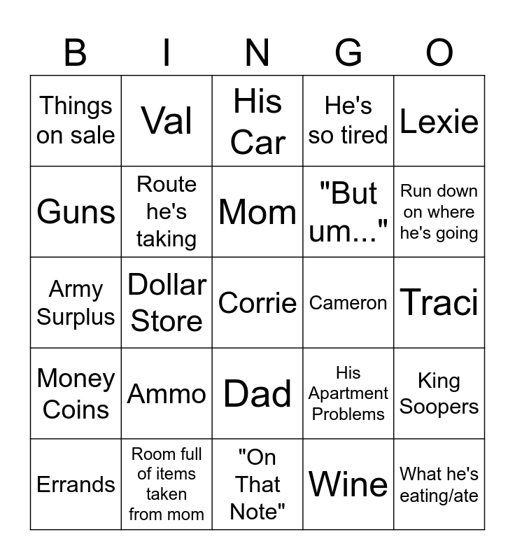 This bingo card has 25 words: Ammo, "On That Note", Mom, Errands, Lexie, Things on sale, Guns, Val, Cameron, Dad, "But um...", Army Surplus, His Apartment Problems, King Soopers, Route he's taking, What he's eating/ate, Traci, His Car, Run down on where he's going, Dollar Store, Corrie, Room full of items taken from mom, Money Coins, He's so tired and Wine.