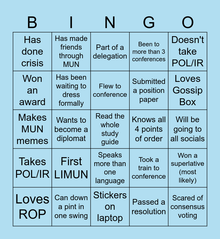 MUN Bingo | Cut Team Member Bingo | QMUN Bingo | SISMUN BINGO! | PMUNC HUMAN BINGO!