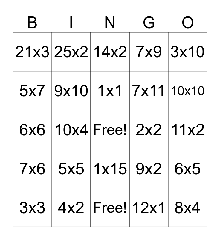 This bingo card has a free space and 24 words: 5x5, 4x2, 1x1, 3x3, 3x10, 21x3, 5x7, 25x2, 2x2, 1x15, 7x11, 6x6, 9x2, 6x5, 9x10, 12x1, 11x2, 14x2, 10x10, 10x4, 8x4, 7x6, 7x9 and Free!.