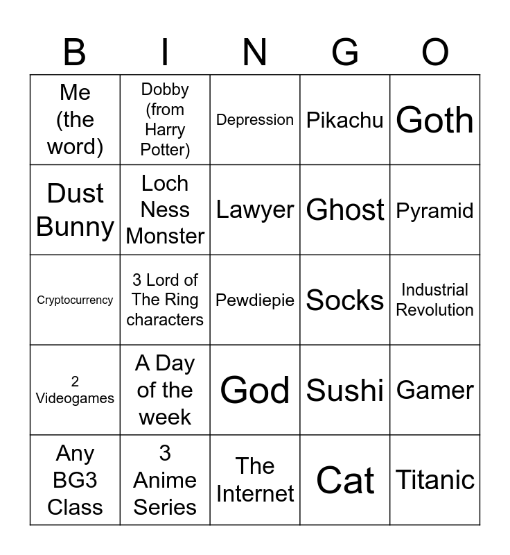 This bingo card has a free space and 24 words: A Day of the week, 3 Anime Series, Lawyer, Any BG3 Class, Goth, Me (the word), Dust Bunny, Dobby (from Harry Potter), Socks, God, Ghost, Cryptocurrency, Sushi, Gamer, Loch Ness Monster, Cat, Industrial Revolution, Depression, Pyramid, 3 Lord of The Ring characters, Titanic, 2 Videogames, Pikachu and The Internet.