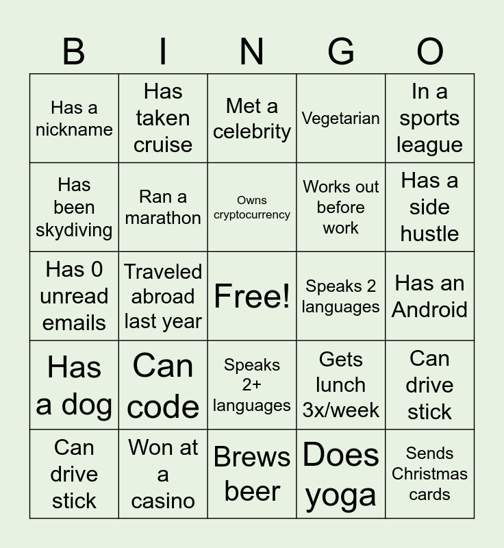 This bingo card has a free space and 24 words: Can code, Won at a casino, Owns cryptocurrency, Can drive stick, In a sports league, Has a nickname, Has been skydiving, Has taken cruise, Speaks 2 languages, Speaks 2+ languages, Works out before work, Has 0 unread emails, Gets lunch 3x/week, Can drive stick, Ran a marathon, Does yoga, Has an Android, Met a celebrity, Has a side hustle, Traveled abroad last year, Sends Christmas cards, Has a dog, Vegetarian and Brews beer.